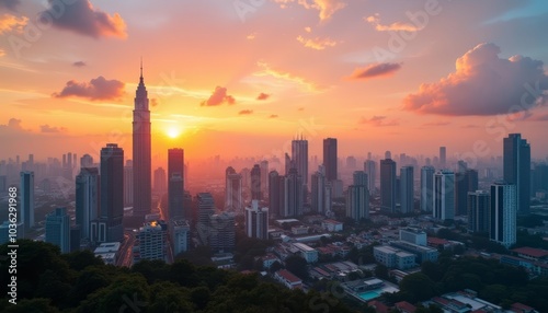 © SwathiFX, Fototapeta premium Cityscape at sunrise with clouds and skyscrapers