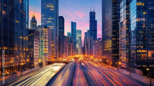 © fajar, Fototapeta premium Cityscape at sunset, highway with light trails, skyscrapers.