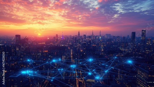 © argus, Fototapeta premium Cityscape at sunset, network overlay