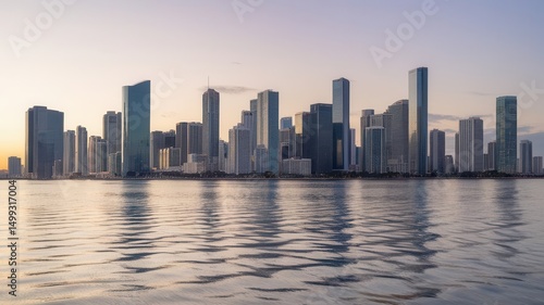 Fototapeta premium Cityscape at sunset reflecting on calm waters a mesmerizing modern panorama
