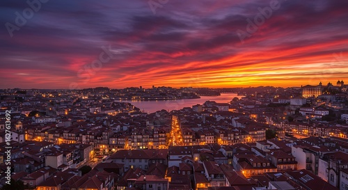 Obraz premium Cityscape at Sunset with Colorful Sky and Illuminated Streets