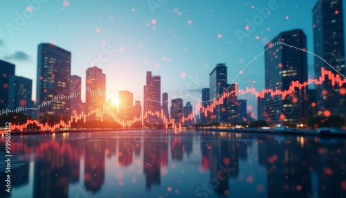 © SwathiFX, Fototapeta premium Cityscape at sunset with financial charts symbolizing economic growth and prosperity