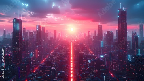 © amirfaoezan, Fototapeta premium Cityscape at Sunset with Glowing Lights and High Rise Buildings