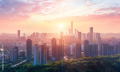 © Pumapala, Fototapeta premium Cityscape at Sunset with Hazy Skies and Green Trees