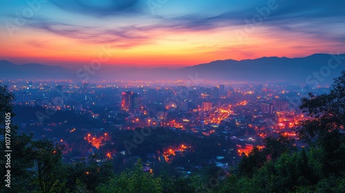 © Andi, Obraz premium Cityscape at sunset with mountains in the background.