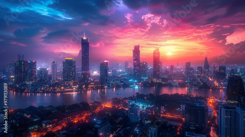 © racesy, Fototapeta premium Cityscape at Sunset with Pink and Blue Skies