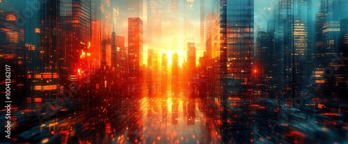 © AIChroma, Naklejka premium Cityscape at Sunset with Reflections in Water