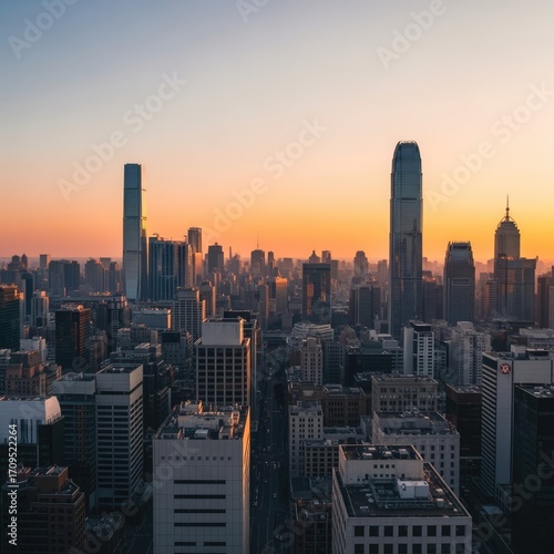 Fototapeta premium Cityscape at Sunset with Skyscrapers and Urban Skyline