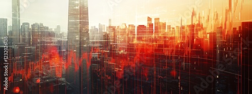 Fototapeta premium Cityscape at sunset with superimposed stock market data.
