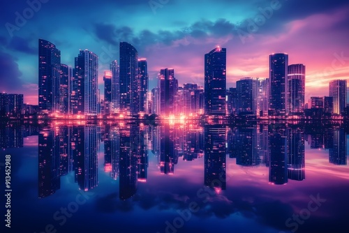 © Prabodha, Obraz premium Cityscape at the blue hour, featuring high-rise buildings with their lights reflecting on a tranquil lake