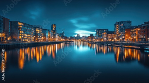 © Putra, Fototapeta premium Cityscape at twilight reflecting on a calm river