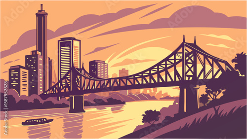 Obraz premium Cityscape bridge river sunset vector illustration for travel and tourism background design landscape art