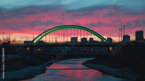 © Biancaart, Naklejka premium Cityscape Bridge Sunset River Reflection Buildings