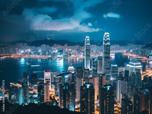 © Llama-World-studio, Obraz premium Cityscape charm: blurred lights twinkling from Victoria Peak