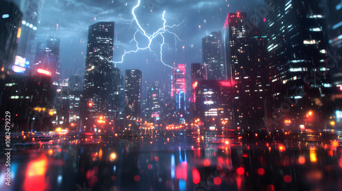 Fototapeta premium cityscape city downtown storm heavy rainfall thunderstorm lightning rain...