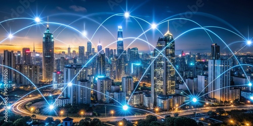 Fototapeta premium Cityscape Connected by Network Lines, Night, Urban, Technology, Innovation...