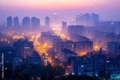 Obraz premium Cityscape emerging from fog at dusk, illuminating urban skyline