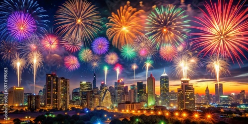 © NorthStar Creations, Obraz premium Cityscape Fireworks Display, Night Sky, Urban Celebration, Light Show, Skyline