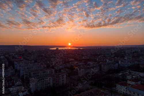© Edi, Fototapeta premium Cityscape from above. Sunset with dramatic clouds with drone