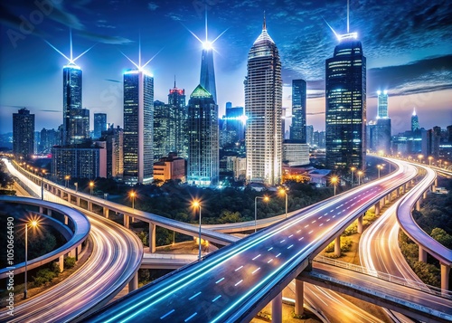 Fototapeta premium "Cityscape Fusion: Illuminated Buildings, Wireless Network & Light Trails"