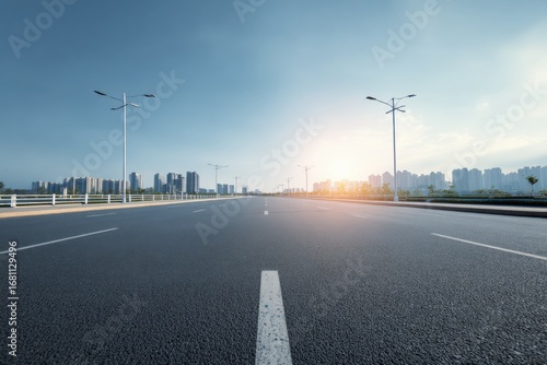 Fototapeta premium Cityscape Highway at Sunset: Modern Urban Road with Skyline, Asphalt Surface, and Bright Sunlight
