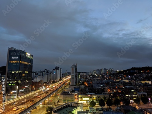 © hajo, Obraz premium Cityscape Highway Traffic at Dusk