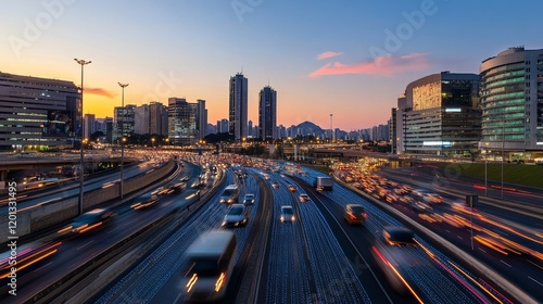 © Ilja, Fototapeta premium Cityscape, Highway Traffic at Sunset with City Skyline and Mountains in the Background
