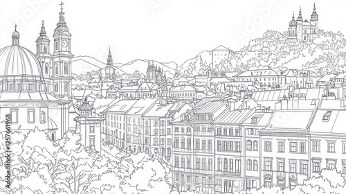 Fototapeta premium Cityscape, hilltop church, European architecture, trees, coloring book