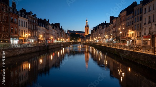Fototapeta premium Cityscape illuminated along canal at dusk