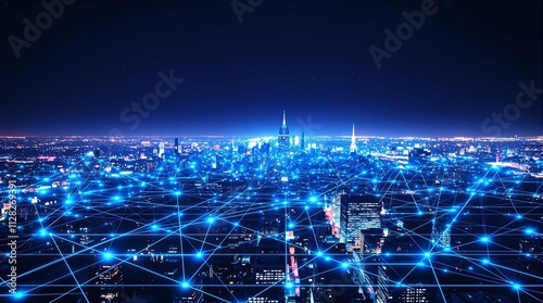 Fototapeta premium Cityscape illuminated with blue interconnected network lines at night.