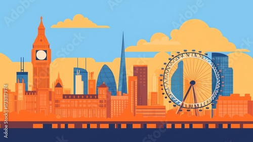© billa stock, Fototapeta premium Cityscape illustration featuring buildings and structures under a blue sky