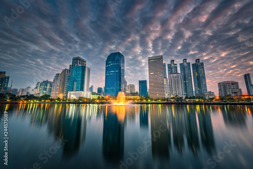 © nuttawutnuy, Fototapeta premium Cityscape image of Benchakitti Park at twilight time in Bangkok, Thailand.