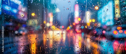 © Seksan, Obraz premium cityscape in rain, reflections and lights, moody atmosphere, focus on, dynamic colors, Double exposure silhouette with raindrops