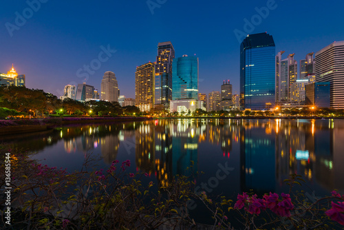 Naklejka premium Cityscape in the evening view from Benjakiti park in Bangkok, Thailand.