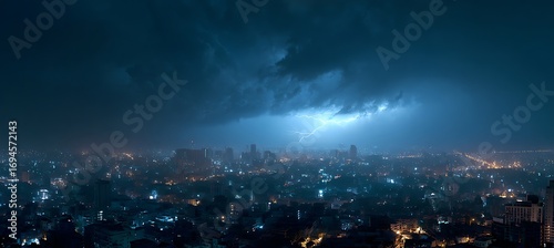 © Iqra, Obraz premium Cityscape lightning storm aerial view dramatic sky urban landscape night scene thunderstorm photography