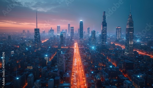 Fototapeta premium Cityscape lit with interconnected network. Modern skyscrapers illuminated by...