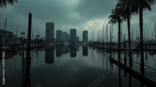 Naklejka premium Cityscape marina dawn, foggy harbor, reflections, boats, moody