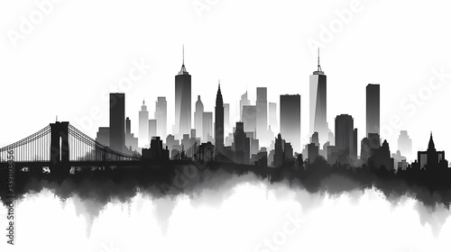 Naklejka premium Cityscape: Monochrome Skyline Silhouette with Skyscrapers and Bridge in Fog -...