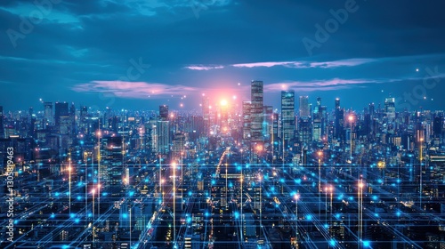 Obraz premium Cityscape, network, night, digital, glow, future, technology, urban, connection, innovation