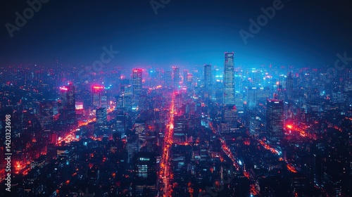© rasya, Fototapeta premium Cityscape night aerial view with illuminated streets and hazy skyline