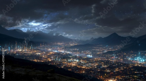 © maulana, Obraz premium Cityscape night panorama mountains