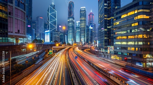 © theerachai, Obraz premium Cityscape Night Traffic Lights Trails Skyscrapers Highway
