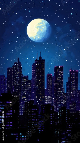 Naklejka premium Cityscape Night View Underneath Full Moon And Stars