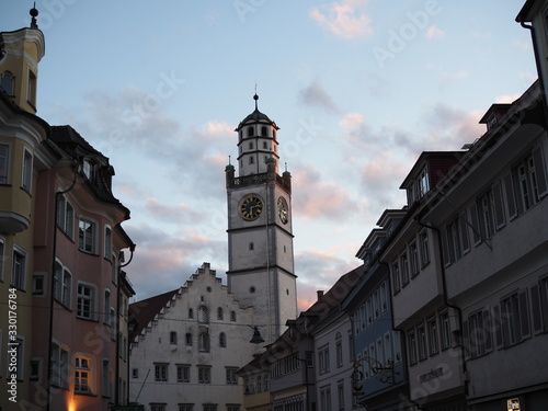 © Juergen, Fototapeta premium cityscape of an old town with tower against clouds at sunset