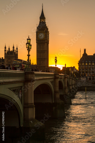 Naklejka premium Cityscape of Big Ben and Westminster Bridge with river Thames at sunset...