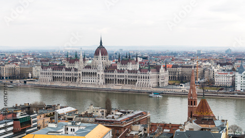 © aerial333, Obraz premium Cityscape of Budapest with hungarian parliament building on Danube river seen from the Buda side on a cloudy day