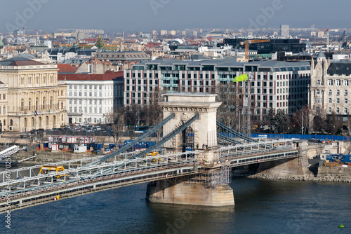 © slobodan, Obraz premium Cityscape of budapest with Szechenyi chain bridge over Danube river under renovation