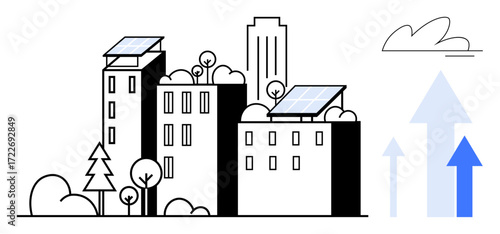 Fototapeta premium Cityscape of buildings with solar panels beside growing arrows and minimal trees. Ideal for sustainability, eco-technology, renewable energy, urban planning, environmental growth, clean energy