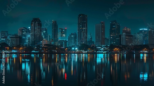 Naklejka premium Cityscape of downtown Bangkok, Thailand, at night with reflections