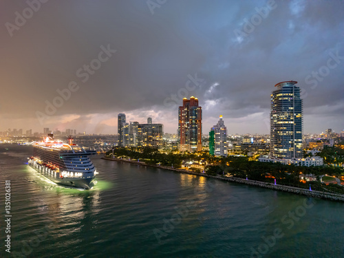 © Volodymyr, Fototapeta premium Cityscape of downtown Miami at night light. Famous Florida resorts and beaches. Midnight city lights in Miami. Waterfront view of Miami. Aerial shot of Miami at sunrise. Neon Art Deco. Ocean drive.